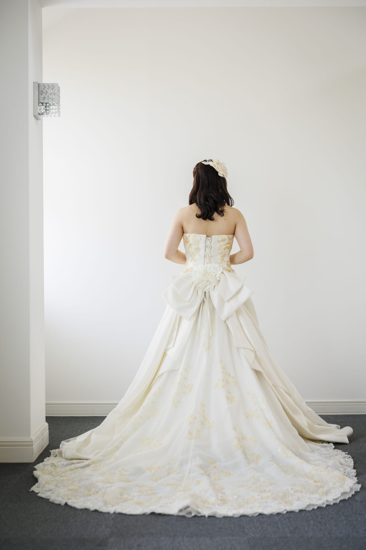 ビスチェ部分には立体的な刺繍とビーディングが丁寧にあしらわれ、360度どこから見ても美しい仕上がり。