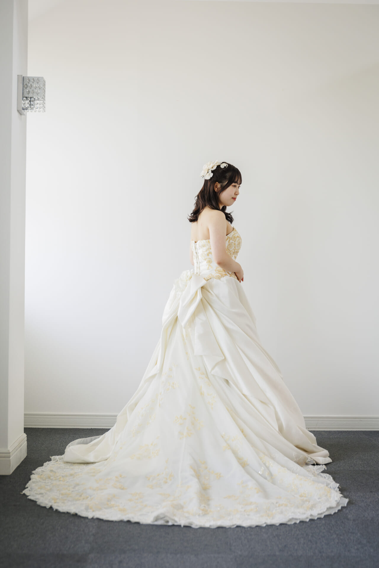 さらに広がるロングトレーンには、繊細なレースのスカラップが贅沢に施され、後ろ姿までも華やかに演出してくれます。