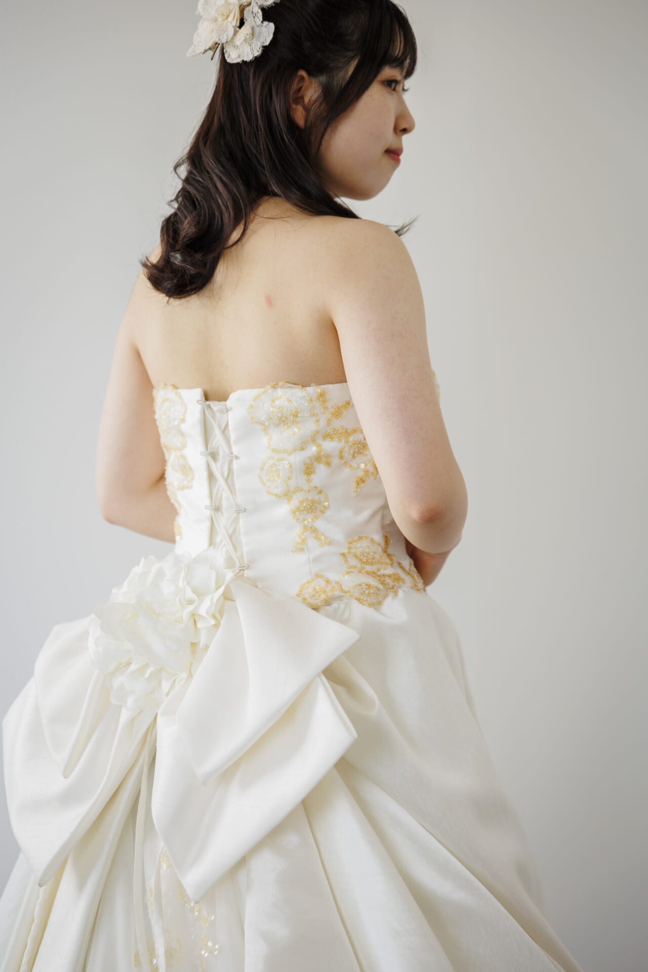 バックスタイルには、大ぶりの立体リボンとフラワーモチーフをあしらい、腰位置を高く見せつつエレガントな印象に。
