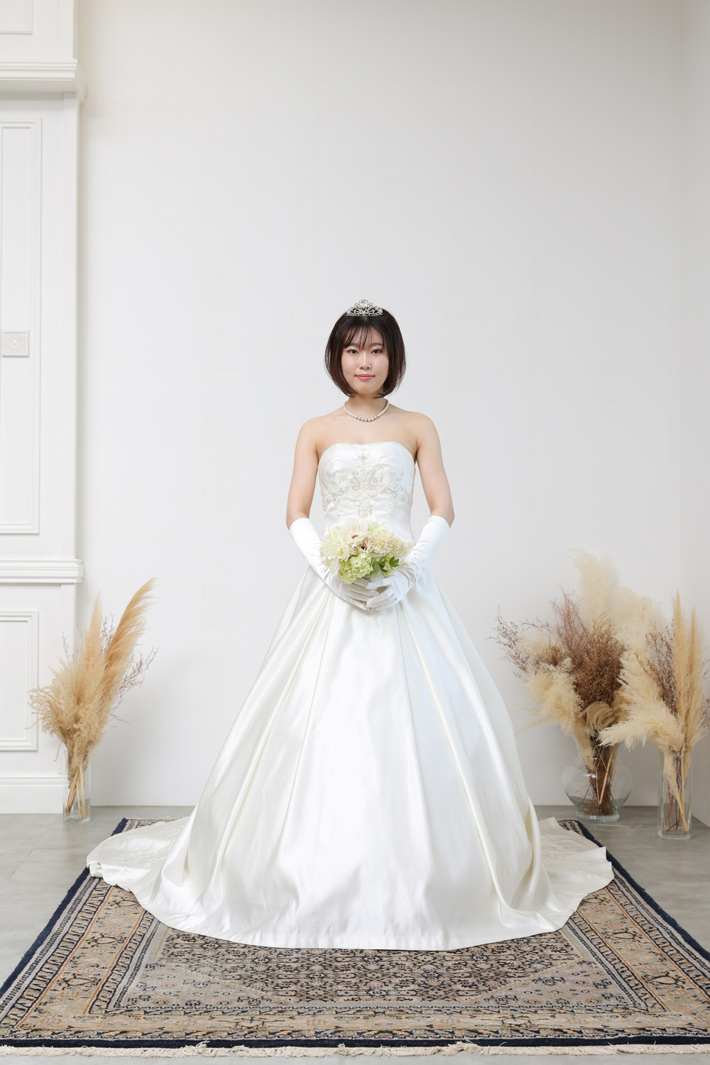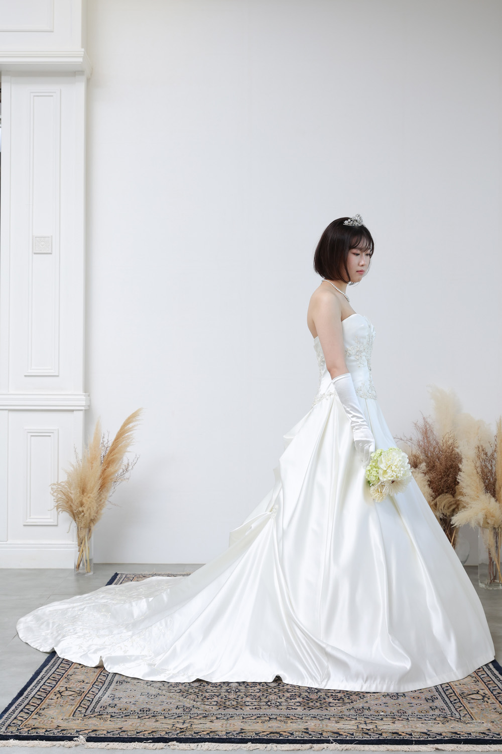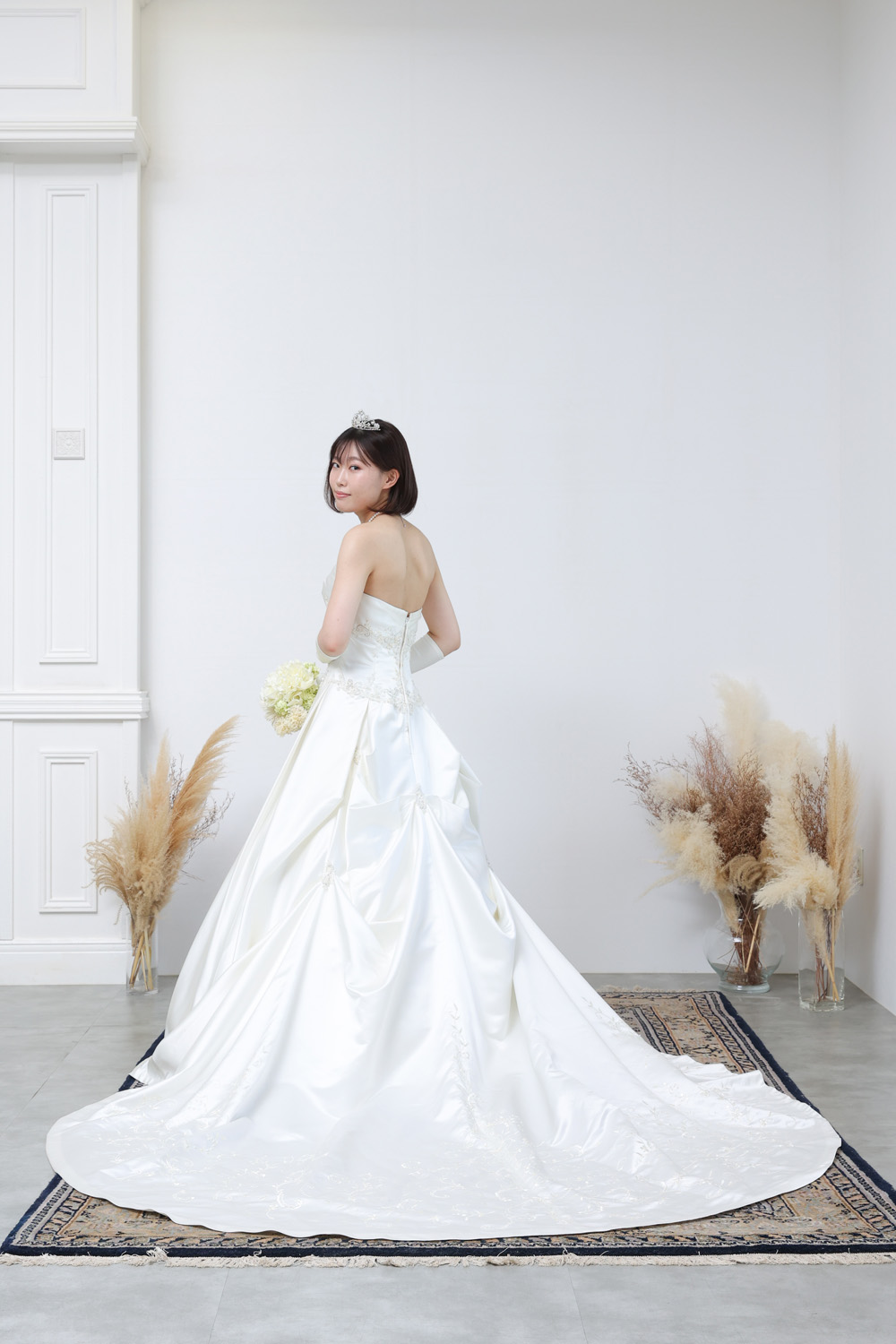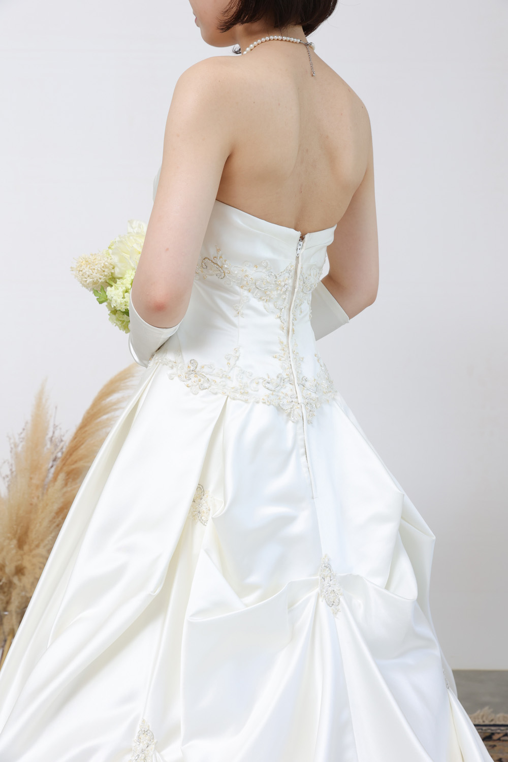 上品な光沢を放つサテン地と、繊細なレース使いが美しく調和した、正統派クラシカルスタイルの1着。高級感のあるミカドサテンのような素材は、程よいハリとツヤ感があり、花嫁の存在感を際立たせます。胸元はすっきりとしたストレートビスチェでデコルテを美しく見せつつ、ウエストラインにあしらわれたレースとビジューがさりげない華やかさをプラス。スカートには優雅なタックが施され、広がりすぎず程よくエレガントなシルエットを描きます。バックスタイルには立体的なリボンモチーフがあしらわれ、長めのトレーンと相まって上品な華やかさを演出。すそ周りにはレースの縁取りが施され、歩くたびに繊細な美しさが際立ちます。格式あるチャペル式はもちろん、ホテルや洋館での前撮りにもぴったりな一着です。背中はファスナー仕様で、着脱がしやすく、すっきりとしたラインに仕上がります。