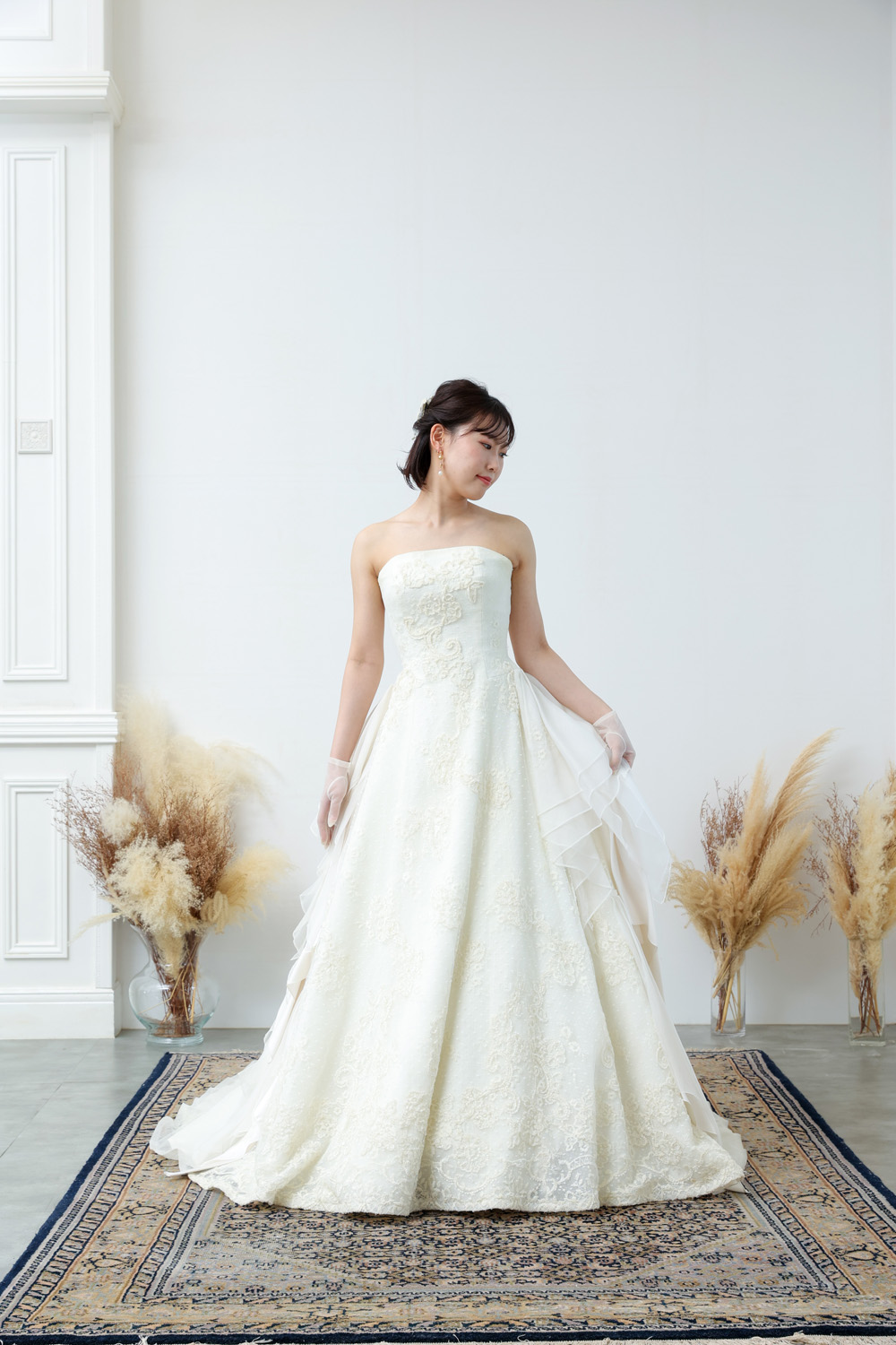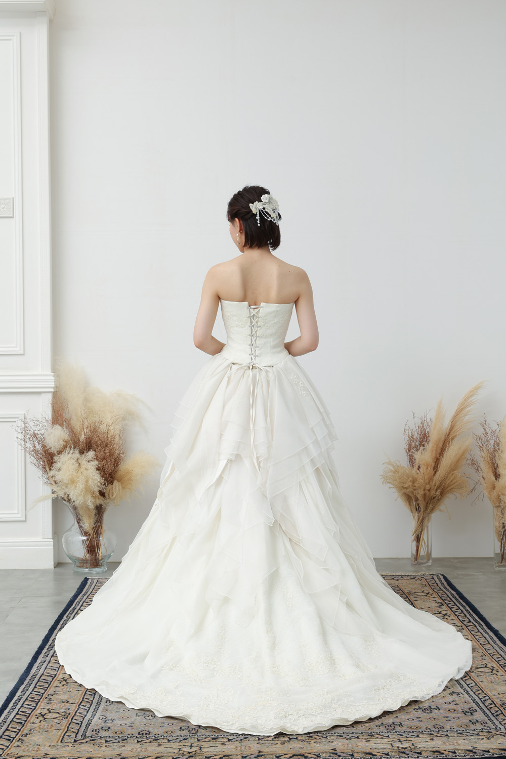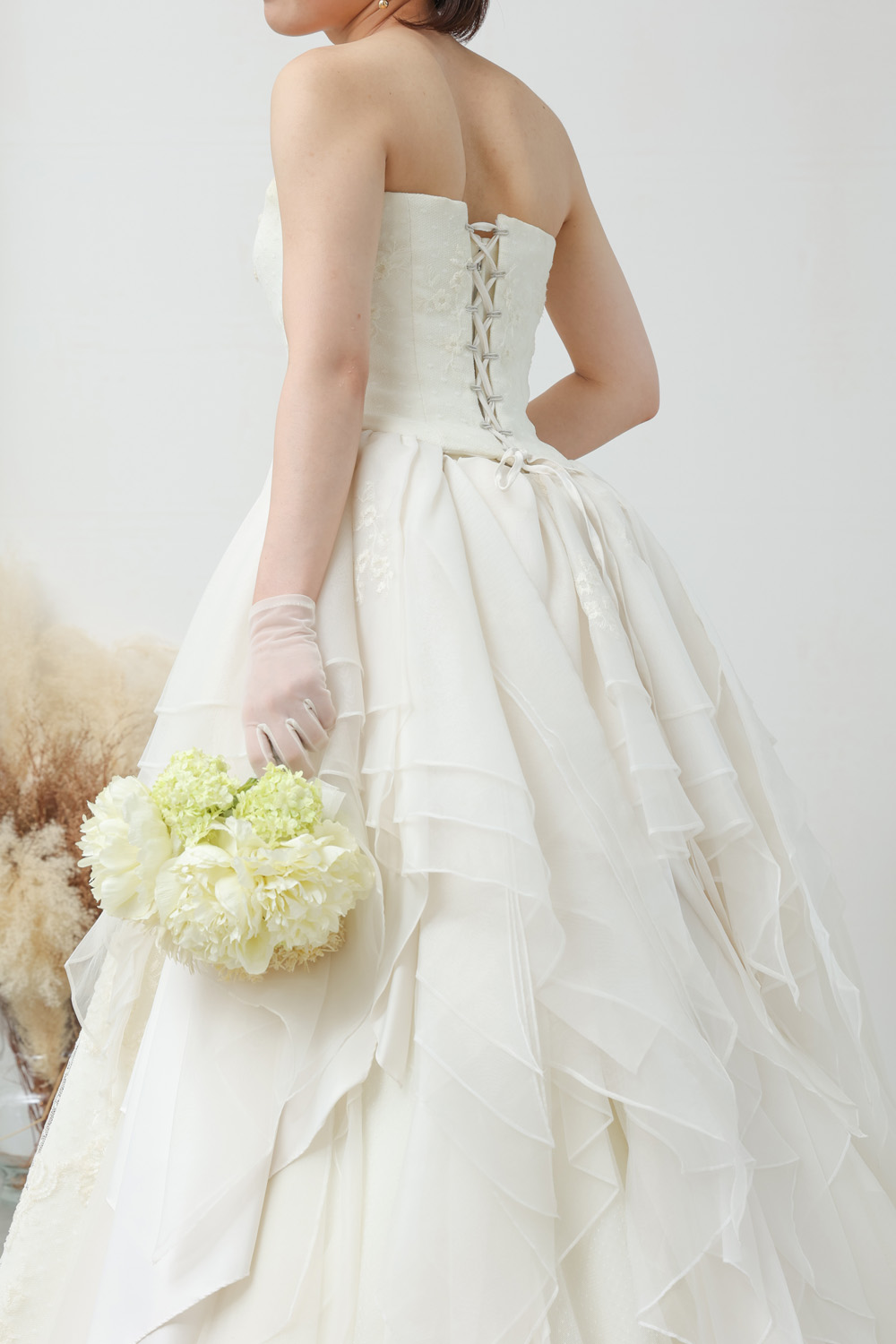 スカートにはややハリ感のあるジャカードレースを贅沢に使用。細やかな柄が光に反射して浮かび上がり、静かな華やかさを添えてくれます。バックスタイルには柔らかなチュールのドレープをあしらい、正面とはまた異なる表情を演出。上品な中にも、さりげないフェミニンさを感じさせるデザインです。