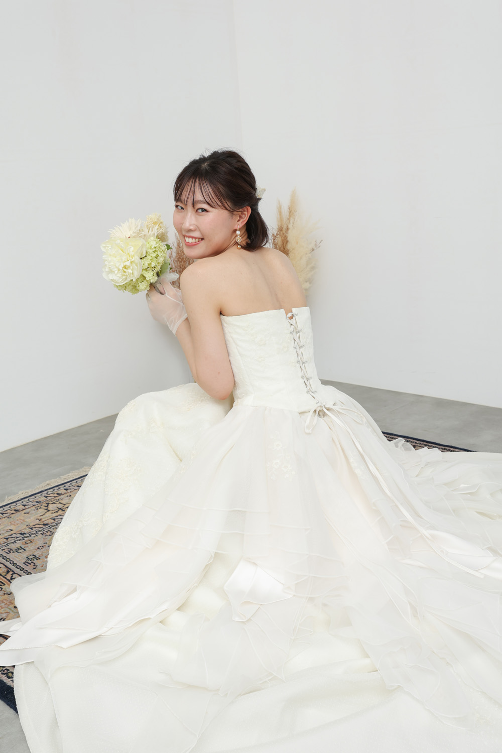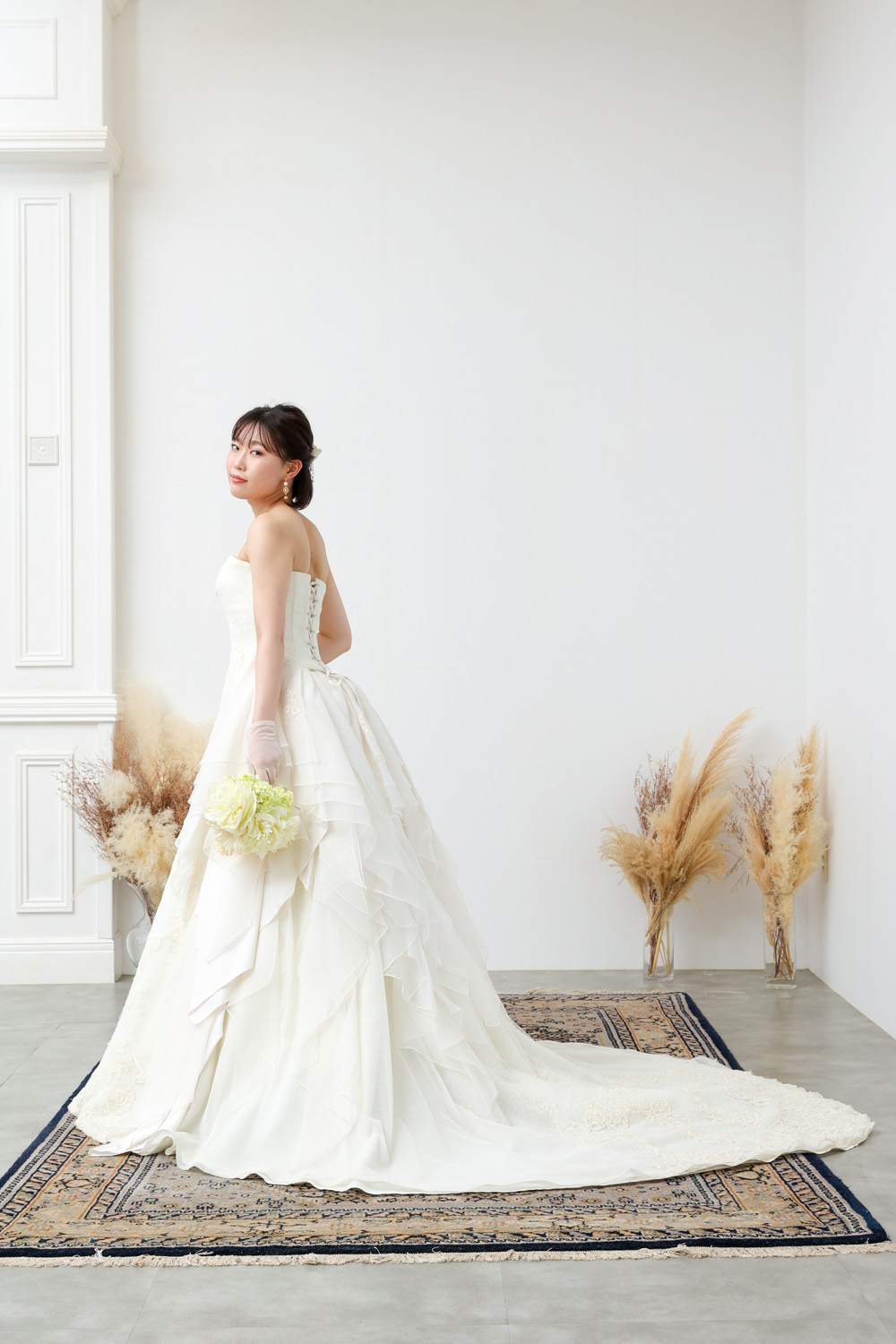 生地には厚みと軽やかさを両立したジャカード素材を使用しているため、シーズン問わず快適に着用いただけます。写真映えも良く、前撮りやフォトウェディングにもおすすめです。